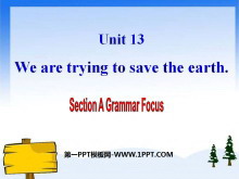 关键词:《We're trying to save the earth!》教学课件,人教版九年级下册英语课件,九年级英语幻灯片课件下载,《We're trying to save the earth!》PPT课件下载,.ppt格式