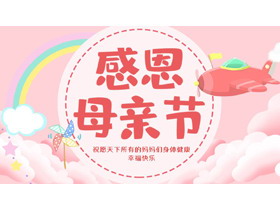 PPT模板封面,使用了卡通飞机背景图片、卡通云彩背景图片、彩虹背景图片。中间填写感恩母亲节PPT标题,设计风格为可爱卡通风格。