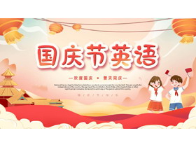 PPT模板封面,使用了卡通小学生背景图片、古建筑背景图片、灯笼背景图片。中间填写国庆节英语PPT标题,设计风格为精美卡通风格。