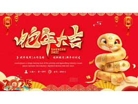 PPT模板封面,使用了红色喜庆背景,搭配金蛇背景图片。左侧填写蛇年大吉PPT标题,设计风格为红色喜庆。