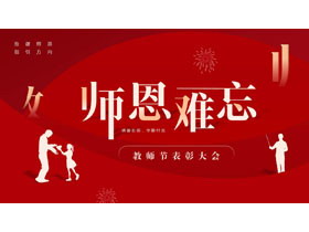 红色教师人物剪影背景的“师恩难忘”教师节表彰大会PPT模板