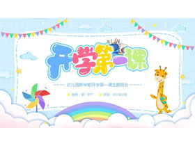 PPT模板封面,使用了卡通小动物背景图片、卡通风车背景图片、卡通彩虹背景图片。中间填写开学第一课PPT标题,设计风格为可爱卡通风格。