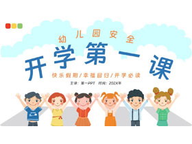 可爱卡通小朋友背景的幼儿园安全开学第一课主题班会PPT模板下载