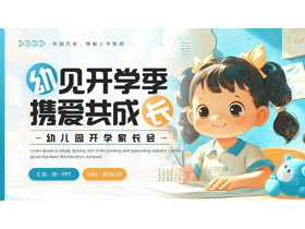这是一套蓝橙插画女孩背景的“幼见开学季携爱共成长”幼儿园开学家长会PPT模板,共36页;
