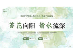 绿色水彩晕染背景的“苔花向阳静水流深”年终项目总结汇报PPT模板下载