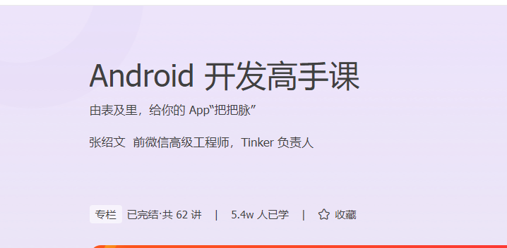 “Android 开发高手课”是一门为 Android 开发者量身定制的进阶课程。专栏围绕打造高质量应用、实现高效开发和架构演进这三个部分,不仅包含图文、音频的教学,还有作者精心设计的练习 Sample,帮助你快速掌握解决复杂问题的思路和方法,并能结合课后实践切实提升开发能力(注:专栏内容 60% 是 Android 相关的,40% 是可以跨平台的)。