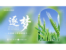 蓝绿毛玻璃样式麦穗背景的“逐梦”小清新工作述职报告PPT模板下载