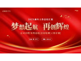 这是一套红金配色“梦想起航再创辉煌”新年工作总结汇报PPT模板,共24页;