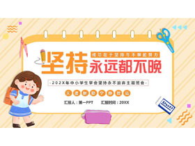 橙色卡通风格的“坚持永远都不晚”中小学生学会坚持永不放弃主题班会PPT模板下载