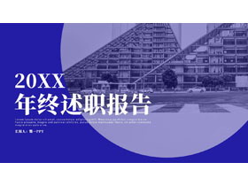 这是一套蓝色城市建筑背景的年终述职报告PPT模板,共24页;