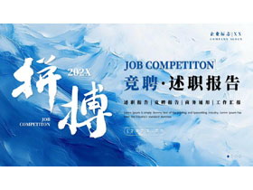 这是一套蓝色创意油彩群山背景的“拼搏”竞聘述职报告PPT模板,共22页;