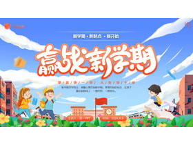 彩色卡通风格的“赢战新学期”开学季主题班会PPT模板下载