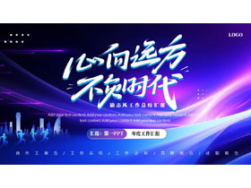 这是一套蓝紫配色城市剪影背景的“心向远方不负时代”励志风工作总结汇报PPT模板,共24页;