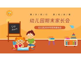 橙色卡通小朋友背景的幼儿园期末家长会PPT模板下载