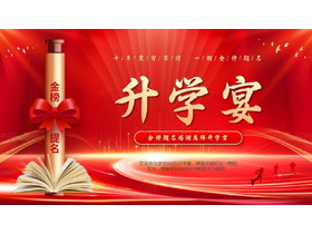 PPT模板封面,使用了红色背景,搭配人物剪影背景图片、书籍背景图片、录取通知书背景图片。右侧填写升学宴PPT标题,设计风格为大气喜庆。