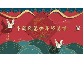 PPT模板封面,使用了仙鹤背景图片、青色波浪曲线背景图片、古典花卉背景图片。中间填写年终总结汇报PPT标题,设计风格为鎏金中国风。